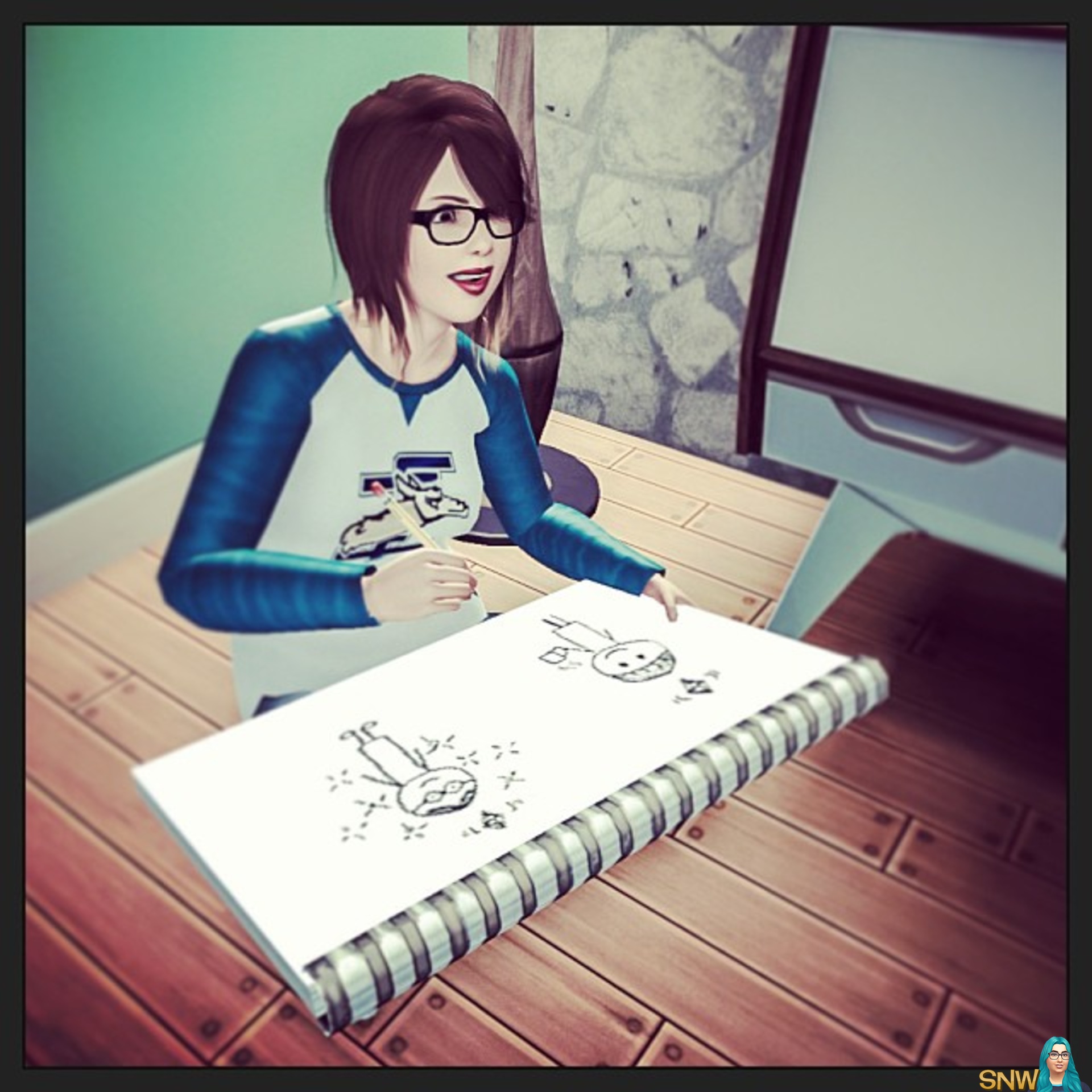 Rosie's not that good yet at this sketching thing, but she'll get there ;) sitting in her room in an apartment in #TheSims3Belmont